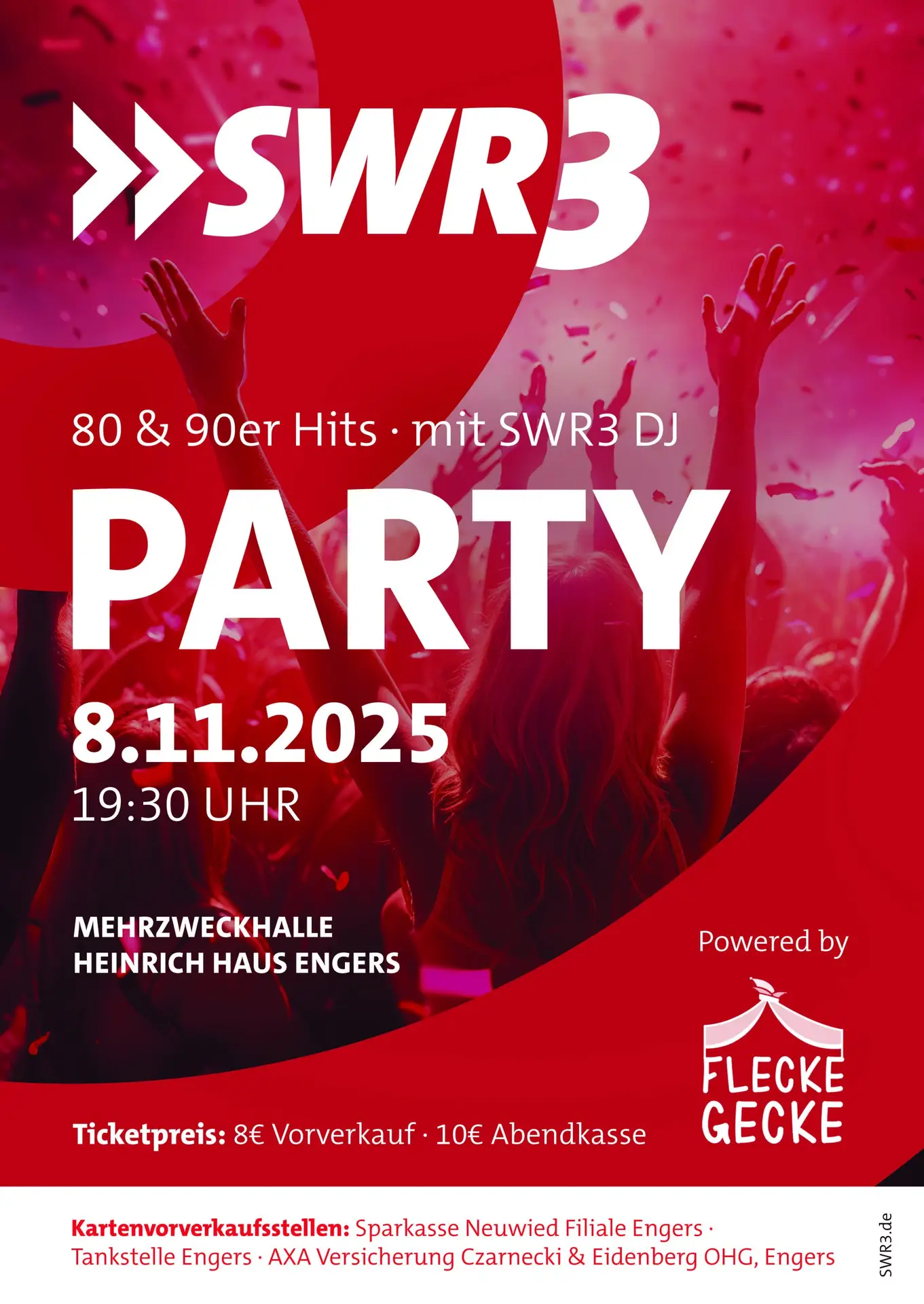 Am 8. November 2025 verwandelt sich die Mehrzweckhalle Heinrich-Haus Engers in die ultimative Partylocation! Feiert mit uns zu den größten Hits der 80er und 90er – präsentiert vom SWR3 DJ.